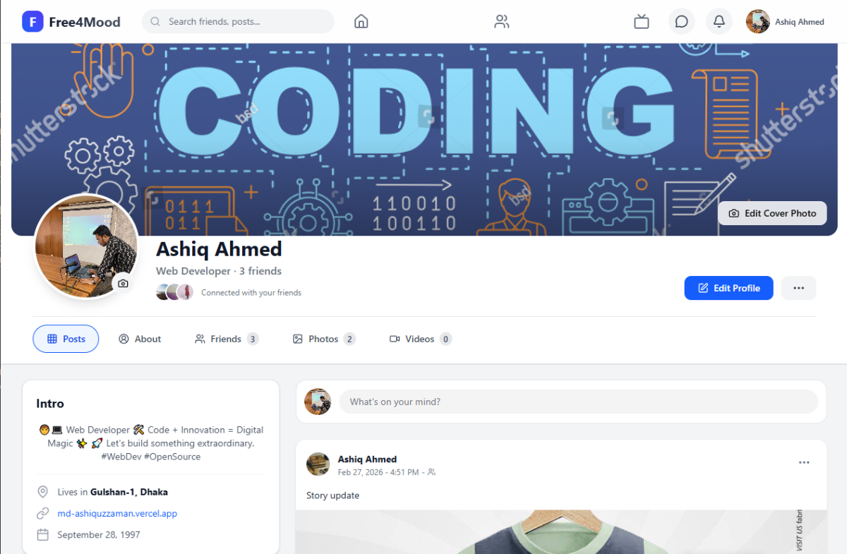 Free4Mood is a modern social media platform designed for open expression and real-time interaction. Users can share thoughts, moods, images, and connect with others through likes, comments, and messaging. The platform focuses on clean UI, smooth performance, and a secure, scalable backend architecture.